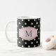 Esta taza personalizado tiene un monograma en un marco ovalado rosa pálido sobre un fondo de antiguos puntos de polka blancos y negros.
