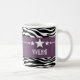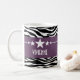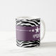 Moderno y moderno Sassy Star Zebra Mug con un fondo de moda de cebra en blanco y negro y un atrevido borde morado adornado con un divertido motivo estrella. Este diseño ondulado puede ser personalizado con el texto personalizado de su elección. Haga clic en "Personalizar" para encontrar más opciones de personalización.