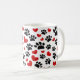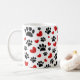 Dibujos de huellas de perros y corazones rojos en muchos tamaños. Efecto purpurina falso aplicado a la imagen. tazas de café personalizado. Idea de regalo para la gente que ama a los perros.
