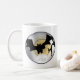 Un murciélago negro de Halloween vuela sobre una lápida que dice "RIP" (QEPD) con camisetas de Halloween bastante aterradoras, tazas, trucos o bolsos de té, y otros artículos que puedes personalizar con un nombre.