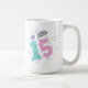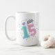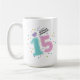 Celebra el cumpleaños de una joven con estilo con esta adorable taza de café personalizable "Quince y fabulosa". Con un pájaro azul caprichoso que canta la frase "Quince y fabulosa", este diseño juguetón está lleno de personalidad. Un gran número con patrón de lunares y corazones 15, confeti colorido y letras de estilo retro dan a este diseño una vibra divertida y juvenil que es perfecta para un regalo de cumpleaños número 15. Agrega un nombre y tu propio sentimiento para crear un recuerdo único que cualquier joven apreciará.
