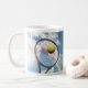 Fotografía de una raqueta de tenis y una pelota contra el cielo azul, las nubes y la luz del sol. Diseño impreso en ambos lados de la taza. Imagen de copyright 2013 de Margaret E. Cmelik.