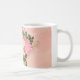 Una taza con un ramo floral de rosas con flores blancas y rosadas. El fondo es rosa con un patrón floral. Diseño bonito y elegante.