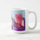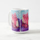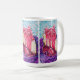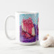 A slice of cake topped with vibrant red raspberries drips with rich sauce onto a dark purple plate. The background features a blue lattice pattern, complementing the dessert's vivid colors.