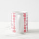 Esta taza tiene un diseño moderno de mediados de siglo de rectángulos redondeados rosa y lavanda en aumento y disminución de tamaño corriendo verticalmente sobre un campo de blanco.