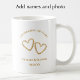 Agrega los nombres de la pareja y la foto a esta única taza de aniversario de bodas de 50 años dorada. La escritura simple y moderna de color dorado no es de lámina real sino de oro falso. Toda la tipografía elegante es editable. Personaliza esta especial taza de café con la foto y la fecha de aniversario de bodas de la pareja para un hermoso regalo de aniversario de bodas. "Celebrando 50 años" se puede personalizar a cualquier número para un aniversario de 60, 40, 25 o cualquier otro año. Creé estos corazones dibujados a mano para su regalo de aniversario de bodas de 50 años. Los dos corazones dorados cobrizos únicos creados con impresiones de hojas y brotes, agregan un toque botánico romántico. Esto sería un gran favor de fiesta para una fiesta de aniversario de bodas de 50 años dorada. La mesa se vería genial con estas tazas conmemorativas y mis servilletas y posavasos de