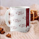 Moderno Navidades estacionales diseño de tazas de café en colores festivos en rojo y blanco, con elegante patrón de tipografía 'Merry and Bright' y una cinta roja mínima con espacio para tu nombre o texto personalizado - el relleno perfecto para un ser querido.