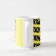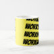 Grandes letras negras dicen trabajar en una taza amarilla.