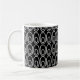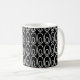 Esta taza tiene un diseño moderno de mediados de siglo de un pequeño oval dentro de un oval más grande en un campo de negro.