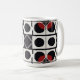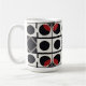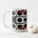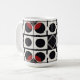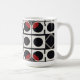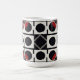 Obra contemporánea de geometría audaz con formas circulares y cuadradas en tonos rojos, negros y blancos contrastantes, con un toque de modernidad y de diseño artístico.