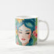 Este diseño vibrante y caprichoso presenta un retrato abstracto de una mujer con el pelo azul verde azulado adornado con flores de colores. Su expresión serena se acentúa con los ojos cerrados y los labios rojos, dándole una apariencia de ensueño. A su alrededor hay girasoles vibrantes, flores rosas y un conjunto de follaje verde, creando un ambiente exuberante y de jardín. La pieza tiene un estilo suave, vectorial, pintado, que le da un toque moderno y a la vez romántico. La paleta de colores está dominada por tés, amarillos, rosas y verdes, lo que crea una composición armoniosa y llamativa.
