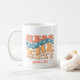 Taza de café retro de soltera para que las amigas de la novia beban durante su fin de semana de despedida de soltera. Texto simple que dice Aquí viene la fiesta y tiene su nombre. La taza perfecta como regalo para la tribu de la novia. Ver tazas a juego de La Fiesta para la novia.