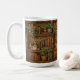 A cozy retro-inspired design featuring a charming bookshelf filled with vintage books, delicate botanical accents, and a comforting cup of tea or coffee.