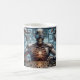 A humanoid robot is seated at a workbench surrounded by tools and intricate components. The setting is futuristic with digital screens in the background.