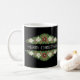 Un Navidad de moda Coffee Mug, con enjambres de Rosas Navidades, Holly e Ivy sobre un fondo negro, con Feliz Navidad con elegantes letras modernas, en blanco. De un diseño pintado a mano por Judy Adamson, ¡este diseño se ve bien en cualquier camiseta negra!