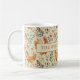 A cute rustic country farm coffee mug, with painted chickens and flowers pattern, and your family name, with an earthy vibe. Gold, green and cream.