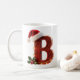 This letter 'B' is special because it combines rustic, warm wood texture with the cozy charm of traditional holiday decorations. The chunky red wooden letter, draped with glowing string lights, and topped with a Santa hat and holly creates a warm, inviting visual. It is perfect for holiday announcements, rustic farmhouse decor, or festive graphic design.