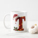 This letter 'T' is special because it combines rustic, warm wood texture with the cozy charm of traditional holiday decorations. The chunky red wooden letter, draped with glowing string lights, and topped with a Santa hat and holly creates a warm, inviting visual. It is perfect for holiday announcements, rustic farmhouse decor, or festive graphic design.