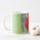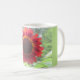 Esta alegre taza cuenta con un girasol rojo oxidado que resplandece del sol que brilla detrás.