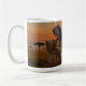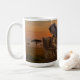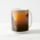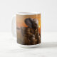 A white coffee mug featuring a funny, photo-realistic image of an elephant dressed in a suit, sitting thoughtfully in an armchair at sunset in the African savanna.