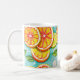 Esta taza clásica presenta un diseño cítrico audaz y vibrante con jugosas rodajas de naranja, limón y lima ilustradas en un estilo moderno y animado. Contra un fondo azul turquesa brillante con acentos similares a salpicaduras y hojas verdes frescas, la obra de arte crea una apariencia enérgica y refrescante que ilumina instantáneamente cualquier cocina o espacio de trabajo. Perfecta para el café de la mañana, té o bebidas acogedoras por la noche, esta taza combina la practicidad diaria con una estética alegre y llamativa. Duradera, brillante y llena de personalidad, aporta un estallido de color a las rutinas diarias y hace un regalo divertido y memorable para los amantes de las frutas y los fanáticos del diseño edificante.