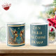 Este encantador y humorístico diseño cuenta con dos ángeles tomando un descanso para tomar el café mientras se asoma a una bulliciosa ciudad cubierta de nieve. El cielo nocturno está bellamente iluminado con tonos azules, verde azulados y amarillos, y arroja un cálido resplandor sobre la ciudad y los ángeles con sus vasos de café.
