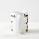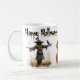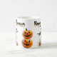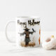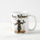 El espantapájaros, con su ropa de patchwork y su gorra de paja, está en una ubicación céntrica, rodeado de tallos de maíz dorado. Las dos calabazas apiladas a la derecha del espantapájaros son brillantes y llamativas. La frase "Halloween feliz" está audazmente escrita en negro, arqueando sobre la escena. La sencillez del fondo blanco hace que aparezcan los elementos coloridos y el mensaje festivo, asegurando una atractiva y alegre taza de Halloween.
