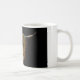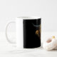 Portret foto van een grote bruine Schotse hooglander, met grote horens, tegen zwarte achtergrond afgedrukt op een beker.