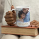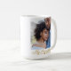 The Script Across Us mug features a centered full-width photo with a flowing cursive phrase My Everything overlaying the bottom. A delicate gold line with a heart accent adds warmth. The clean white base and modern layout create a sleek design that feels deeply heartfelt.