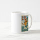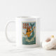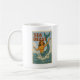 This Sea Beast mermaid is making a splash as she leaps exuberantly out of the water, with her jewel colored tail and shell bra. The humorous twist on retro coastal poster art was created to make you smile. This lighthearted mug is a great way to add seaside vibes to your coffee time.