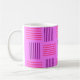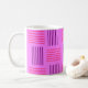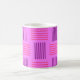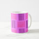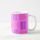 Esta taza tiene un diseño moderno de mediados de siglo que se parece a un tejido de líneas violetas y rosas en un campo de morado más claro.