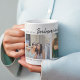 Pide a tu hermana, mejor amiga o sobrina que sea tu dama de honor en tu boda con esta taza de fotocollage moderna y elegante. Con 3 fotos cuadradas de ti y la persona a quien estás pidiendo, con fuente de letra que se puede cambiar a cualquier color. Todo el texto se personaliza fácilmente utilizando la plantilla proporcionada.
