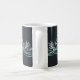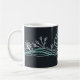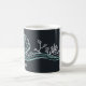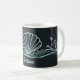 A simple, minimalist line drawing of a scallop shell, waves, and seaweed in seafoam green, on a very dark green background on this beautiful mug.
