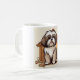 A cute brown‑and‑white Shih Tzu sits in front of a wooden doghouse, surrounded by playful cartoon bones. A sweet, cheerful design that pops beautifully on this ceramic mug — perfect for dog lovers.
