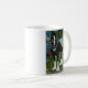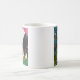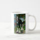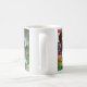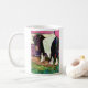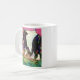Una taza blanca decorada con dos caballos Shire diferentes.