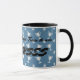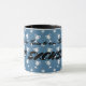 Esta taza se trata de ganar. Tienes que entrenarte duro, tienes que quererlo. El texto envuelto en negro es: "Tren para ganar" y "NO EXCUSAS". O puede escribir en los cuadros para cambiar esto por su propia oferta motivacional, o por ejemplo un nombre. El fondo es azul petróleo, con un patrón de estrellas y trofeos deportivos dispersos de color plateado.