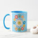 Una taza de café que dice "Rompe con la Rutina" con una imagen inspirada en los 70 de una flor central sonriente, rodeada de flores psicodélicas coloridas es un diseño nostálgico y divertido, a menudo usado por aquellos que buscan una escapada retro de su rutina diaria. Sugiere un deseo de abrazar el espíritu aventurero y de espíritu libre de la década de 1970.
