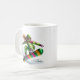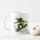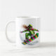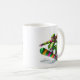 This ceramic coffee mug is shown with a sports snowboarder art print.