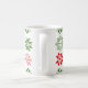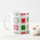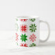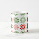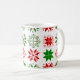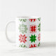 Esta taza tiene un diseño Navidad de diferentes copos de nieve en rojo y verde en filas.