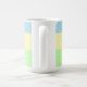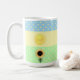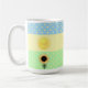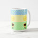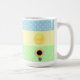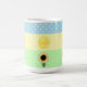 Hermosa taza con sol y lunares en rayas azules, amarillas y verdes.