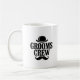 Alimenta el gran día con esta estilosa taza de café "Grooms Crew"! Con un elegante diseño vintage con un clásico sombrero bowler y bigote, esta taza es el accesorio definitivo para el séquito del novio.
