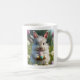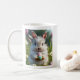 A fluffy white baby bunny gently holding a colorful hand-painted Easter egg. Captured in soft spring sunlight with a dreamy background of green grass and blooming flowers. Pure cuteness and Easter joy in one frame