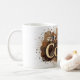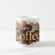 The image features a coffee-themed design. The background includes coffee beans, coffee stains, and brushstrokes in shades of brown.