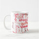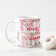Un patrón de nombres de diferentes tipos de letra rojas impresos por toda la superficie de la taza... una idea de patrón tipográfico agradable y creativo para complacer a todos.
