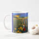 Woman tends her sunflowers in a field of flowers with moon out at night