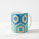 Esta taza tiene un diseño geométrico de hexágonos en cuatro tonos azules sobre un campo de rayas de color marrón en dos tonalidades.