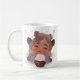 A charming cartoon-style illustration of a cheerful girl with rosy cheeks, lying on her stomach with her feet playfully kicked up. Her eyes are closed, and she has a blissful smile while licking her lips in anticipation of the delicious chocolate dessert with fluffy pink whipped cream in front of her. The warm tones, soft lighting, and floating bubbles create a cozy and dreamy atmosphere, perfectly capturing the joy of indulging in sweet treats.