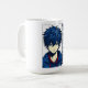 The design centers on a detailed illustration of a young man with vibrant blue hair and intense eyes, wearing a jacket in the style of Japanese pop culture. The art is highly stylized, set against a cream background with a slightly distressed, retro feel. Bold, vertical typography reading "STREETWEAR FASHION" and a cool checkerboard pattern run down the side, emphasizing the urban aesthetic. This is the perfect statement piece for fans of anime, manga, J-fashion, and modern streetwear.