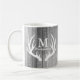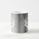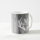 Las astas de madera y blancas grises rústicas de los ciervos siluetean la taza del monograma y del apellido.