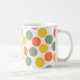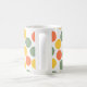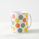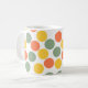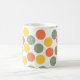 Esta taza tiene un diseño geométrico de puntos en coral, oro y verde salado.